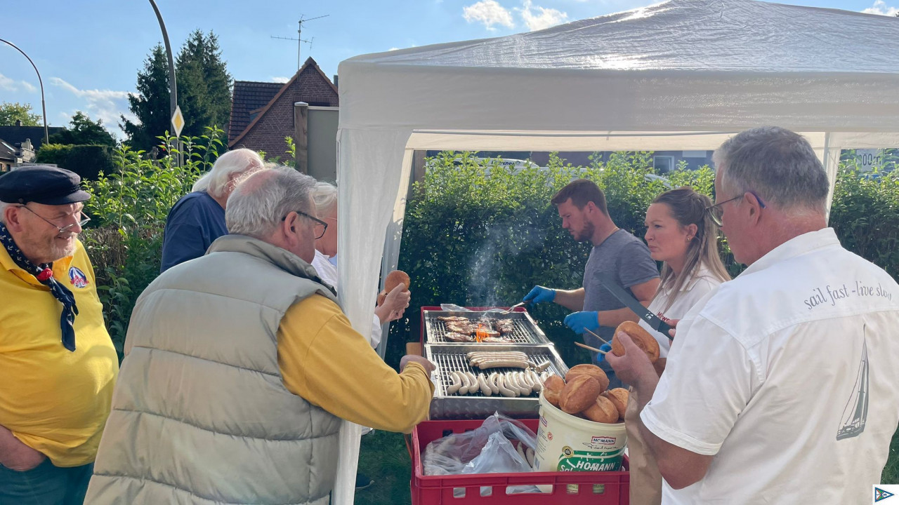 Der Wettergott war uns hold, Commodore Weidling erzählte launige Anekdoten aus der Gründungszeit der SKB, und der HEIDJER-SHANTY-CHOR sorgte für gesungene Untermalung. Die Stadfest-Crew hatte im Vorwege Gelegenheit, den Zeltaufbau schon einmal zu probieren, und der MOORWEGHOF  nutzte die Chance, uns die Steaks für das kommende Stadtfest schon probieren zu lassen. Schließlich müssen wir doch wissen, was wir den Stadtfestbesuchern verkaufen.